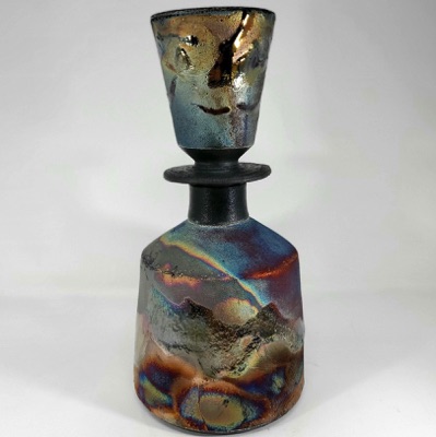 My raku pottery is inspired by my love of geometric forms and the glitz and glamor of shiny metallic glazes. Each piece is unique and forged in flames. I aspire to create pleasing shapes and accentuate them with a balance of glaze and bare clay. Flame and smoke are my paints.