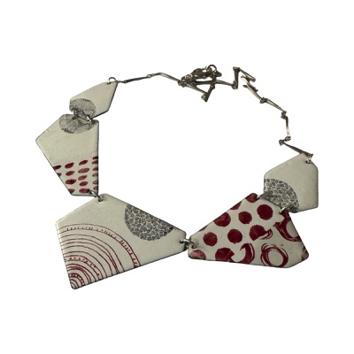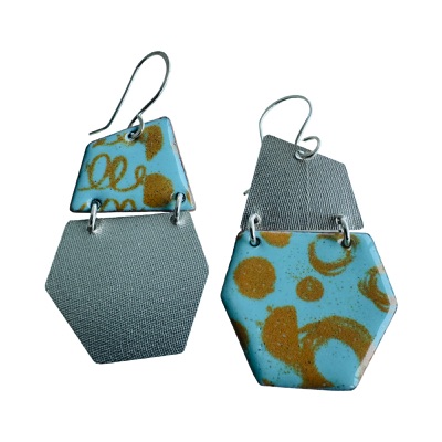 Joan Danoff is a contemporary enamelist using colorful geometric shapes to define her work. Joan uses various enameling techniques such as whimsical hand drawn decals, silk screens, lusters and foils to embellish her jewelry. Striving to improve her craft, Joan has taken multiple workshops from esteemed enamelists, including Jan Harrell, Barbara Minor and Tom Ellis. She continues to improve her craft through new workshops. Formerly a member of the Enamelist Gallery in Alexandria's Torpedo Factory, Joan teaches Beginning Enameling at Silverworks Studio in Glen Echo Park in Bethesda, Maryland.